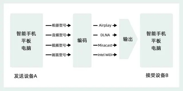 無線投屏的原理是將發(fā)射源的視頻數(shù)據(jù)編碼壓縮,然后通過無線信號發(fā)送到接收器,再由接收器接收后解壓并解碼,還原出相同的視頻數(shù)據(jù)并在顯示設備上同步顯示。簡單理解就是發(fā)射端打包信號數(shù)據(jù),然后以2.4GHz/5GHzWi-Fi高速傳輸?shù)浇邮斩诉M行解壓并播放信號數(shù)據(jù)。